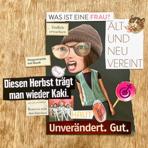 - Es gibt außerdem die Gelegenheit kreative, lustige Kollagen zu den Themen Frau*sein, Weiblichkeit, Menopause etc. zu gestalten. Diese können im Anschluss auf Insta gepostet werden ( für die Sichtbarkeit!!) und als besondere Karten verschenkt, aufgehängt oder anderweitig gewürdigt werden.